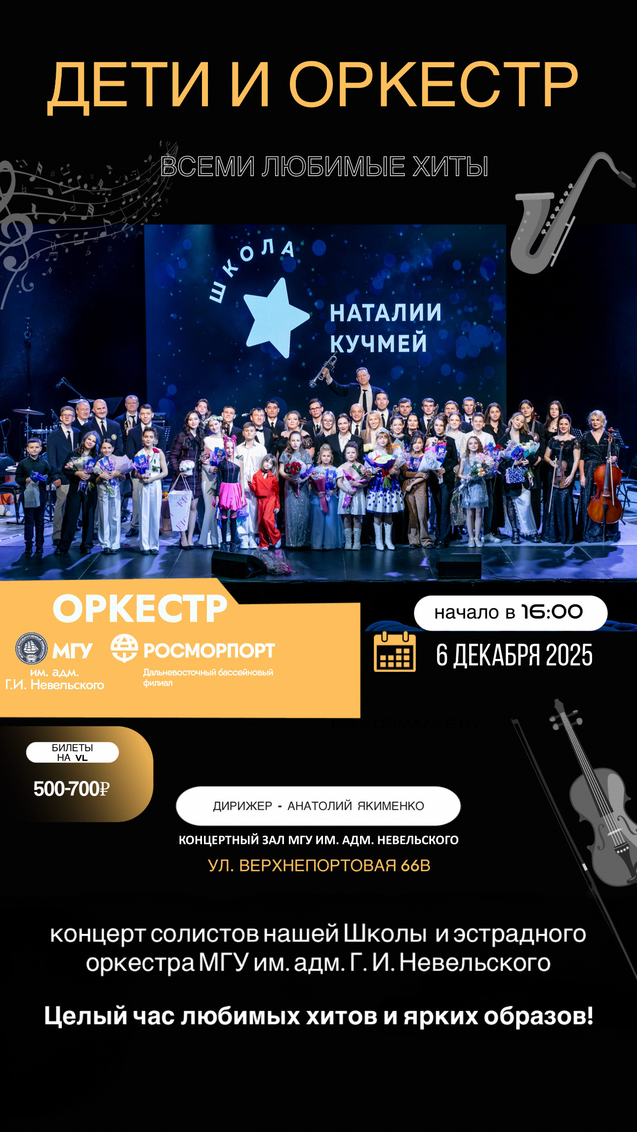 6 декабря в 16:00 в концертном зале МГУ им. адм. Г.И. Невельского состоится концерт солистов Школы Наталии Кучмей и эстрадного оркестра МГУ им. адм. Г. И. Невельского и Дальневосточного филиала ФГУП "Росморпорт".